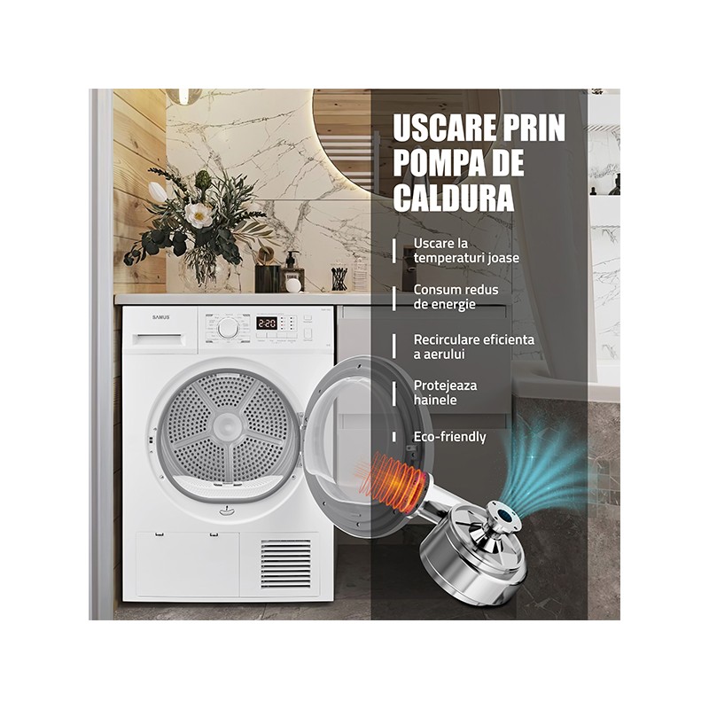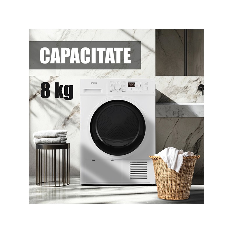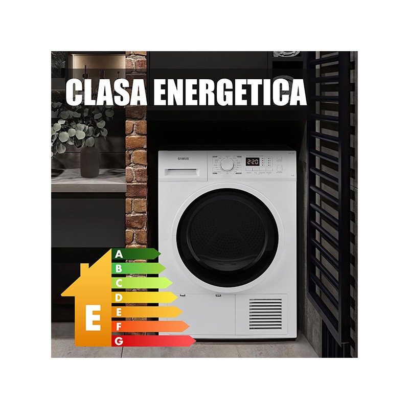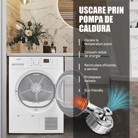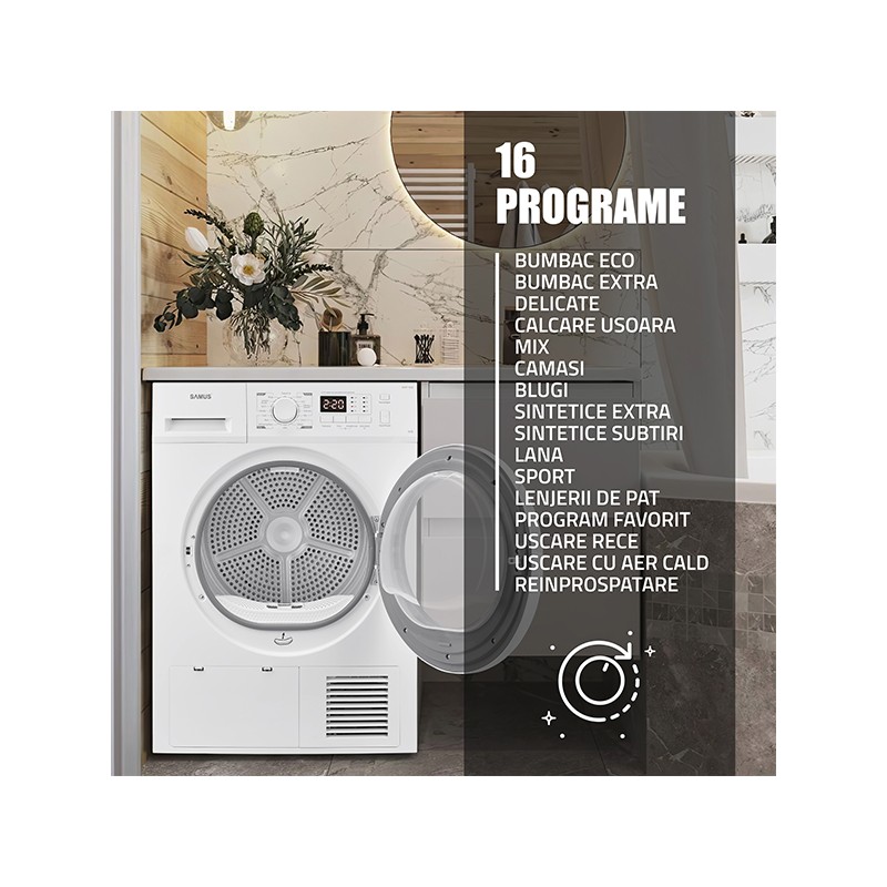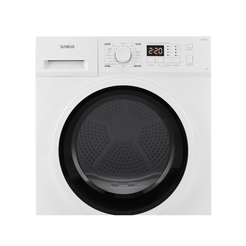 Uscator de rufe Samus SGDP-824, 8 kg, Tip procedura uscare pompa de caldura, 16 programe, Clasa energetica E