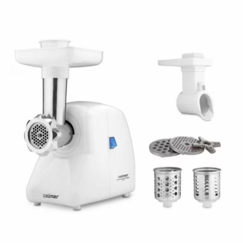 Dupa cum puteti vedea, masina de tocat carne Zelmer este un dispozitiv extrem de usor de utilizat, care va va permite sa macinati rapid carne in chiftele de casa sau sa taiati legumele intr-o salata. Datorita celor doua site metalice, puteti ajusta gradul de macinare la vasul pregatit, iar un tambur special de maruntire va va permite sa gratiti cu usurinta cartofii pentru a pregati clatite de cartofi. Datorita tocatorului, veti economisi mult timp si veti fi siguri, de asemenea, ca carnea tocata este proaspata si de buna calitate.