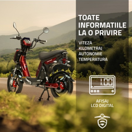 Cu afisajul electronic integrat, scuterul Samus iti ofera informatii esentiale in timp real: viteza, nivelul bateriei, semnalizari si alte functii de baza. Ecranul este clar, intuitiv si usor de citit atat ziua, cat si noaptea, ceea ce iti permite sa monitorizezi rapid starea vehiculului in timpul deplasarii.